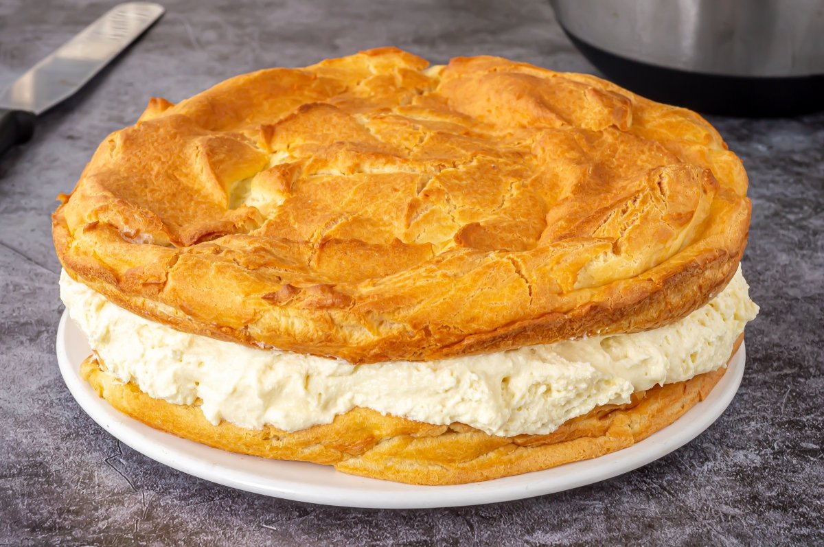 Colocar una capa de masa, cubrir con la crema y tapar con la segunda capa.
