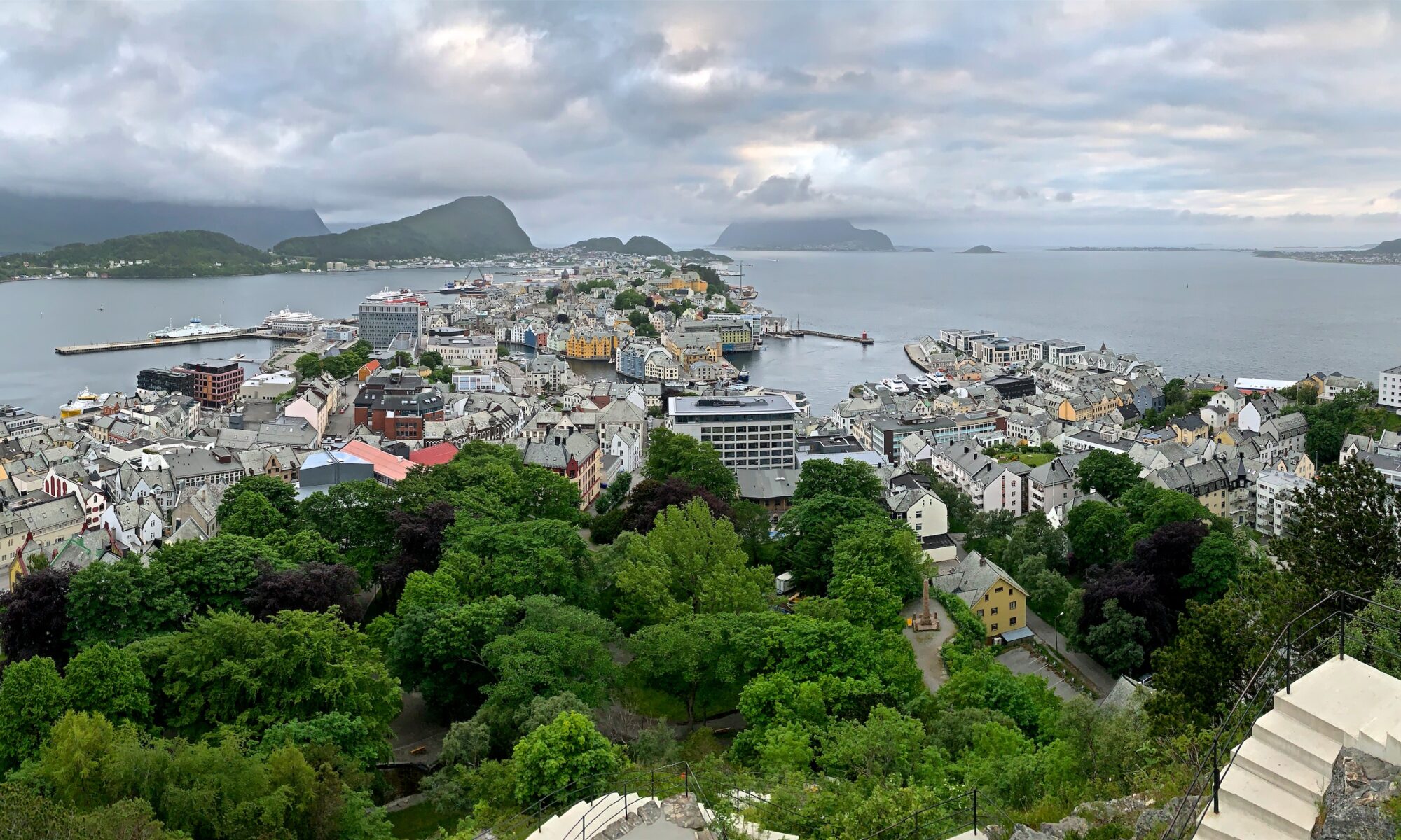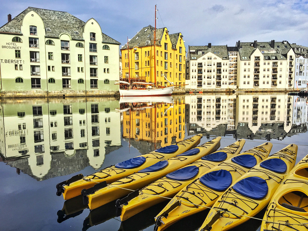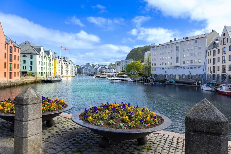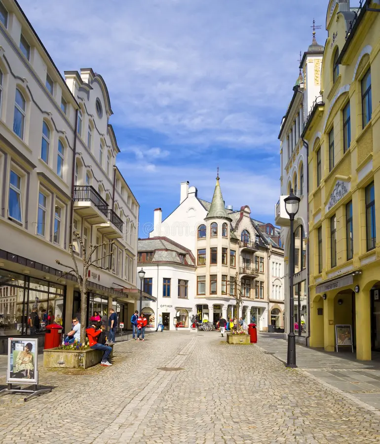 Ålesund es una ciudad portuaria situada en la costa oeste de Noruega, en la región de Møre og Romsdal. Está formada por varias islas conectadas por puentes y túneles, y se ha desarrollado como un importante centro marítimo y pesquero.